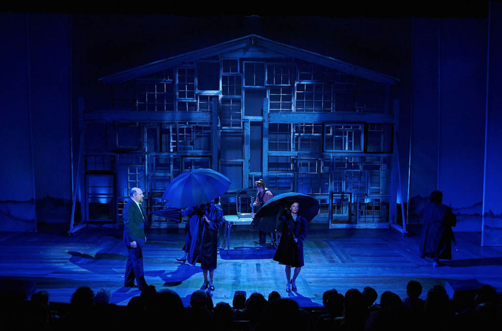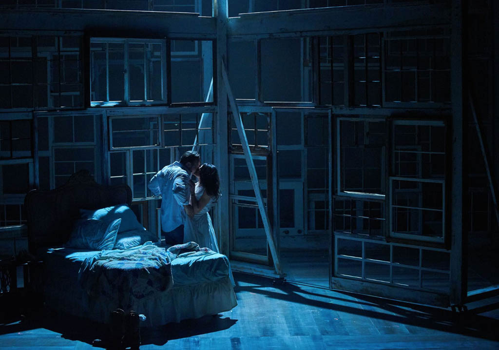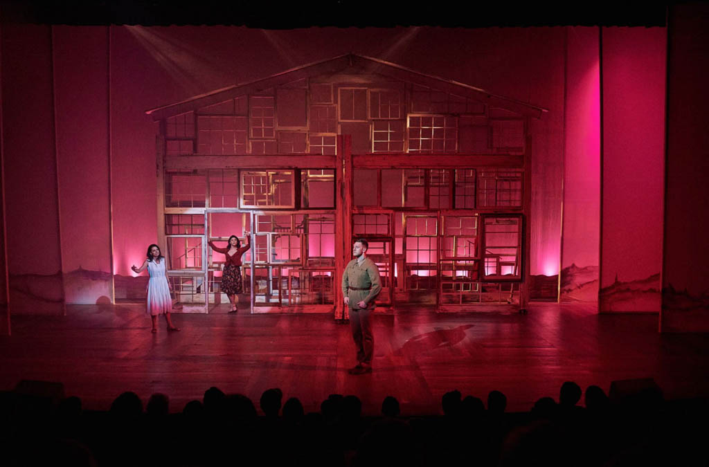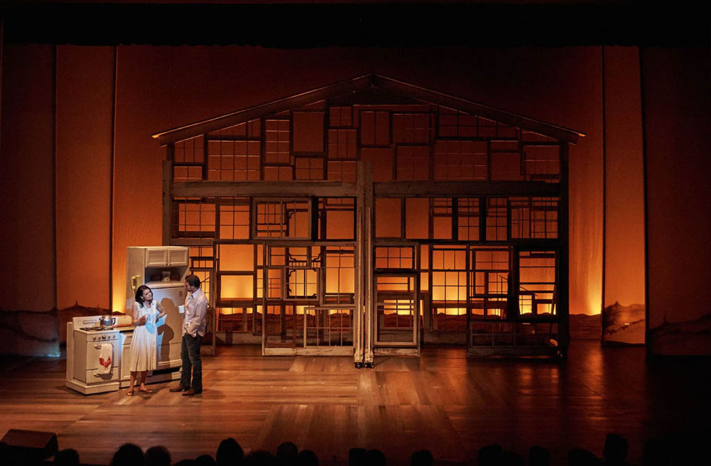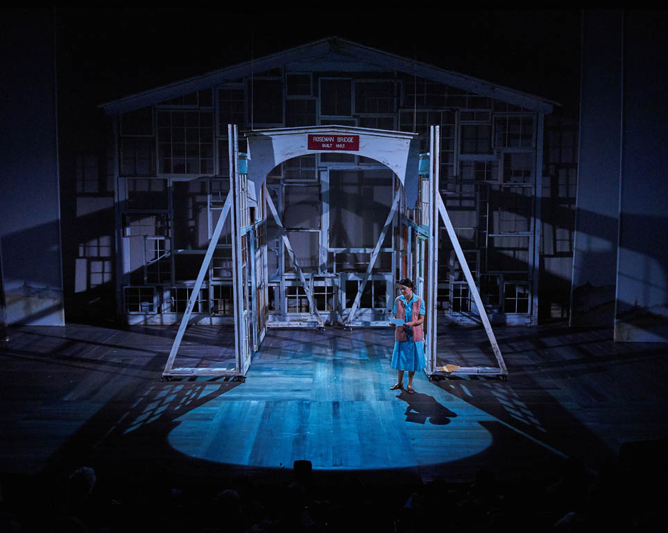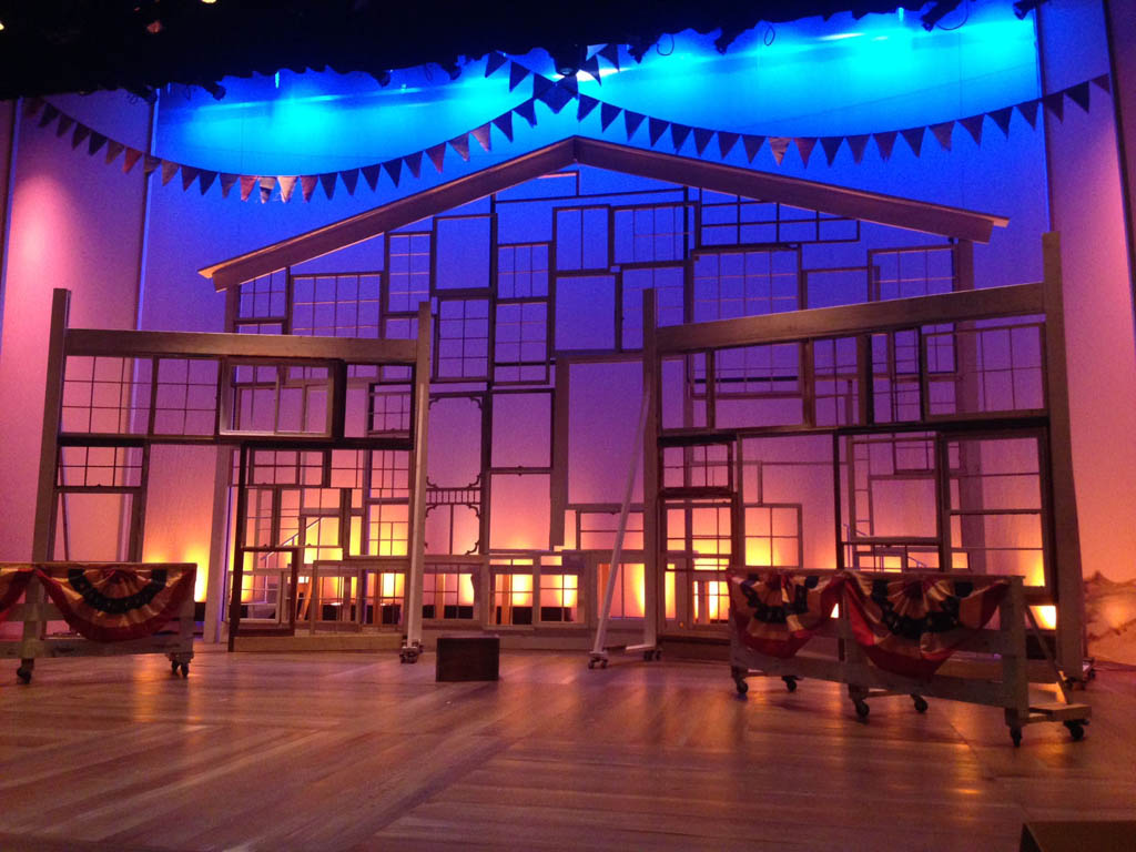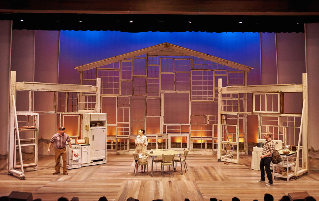 "The other star of Aurora Theatre's production is the gorgeous set by Julie Allardice Ray. The set, which is really not much more complicated than a series of wooden frames made from old screen doors and window casings that cleverly expose the sunsets, sunrises, and starry skies of Iowa, is a powerful metaphor for Francesca's longing. The smaller frames spin around the stage, creating a strong sense of place without bogging us down in the details of the bridge and the interior and exterior spaces of the family farmhouse and beautifully showcasing Francesca's internal struggle as her life is thrown into orbit by her encounter with Robert. The largest frame, shaped like a huge farmhouse, is immovable and omnipresent, always serving as a reminder that Francesca has built a life with her husband and children that will not be easy to cast off." - Broadway World
